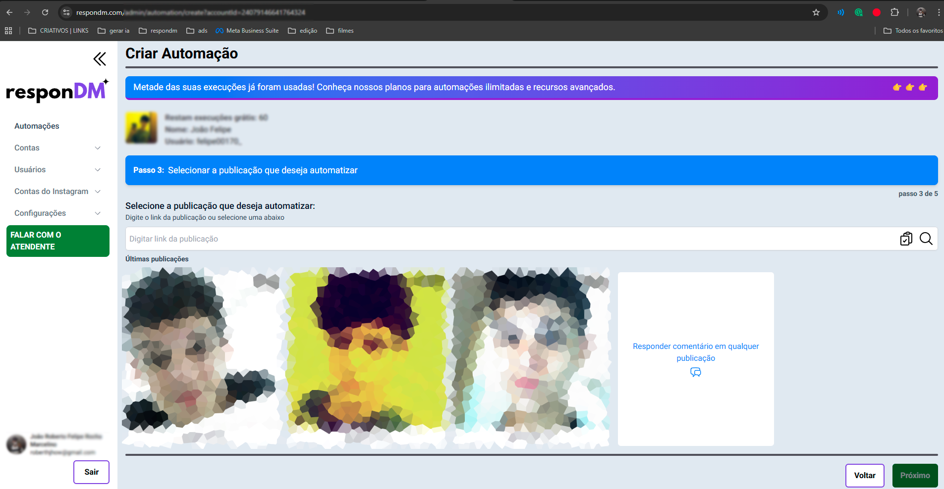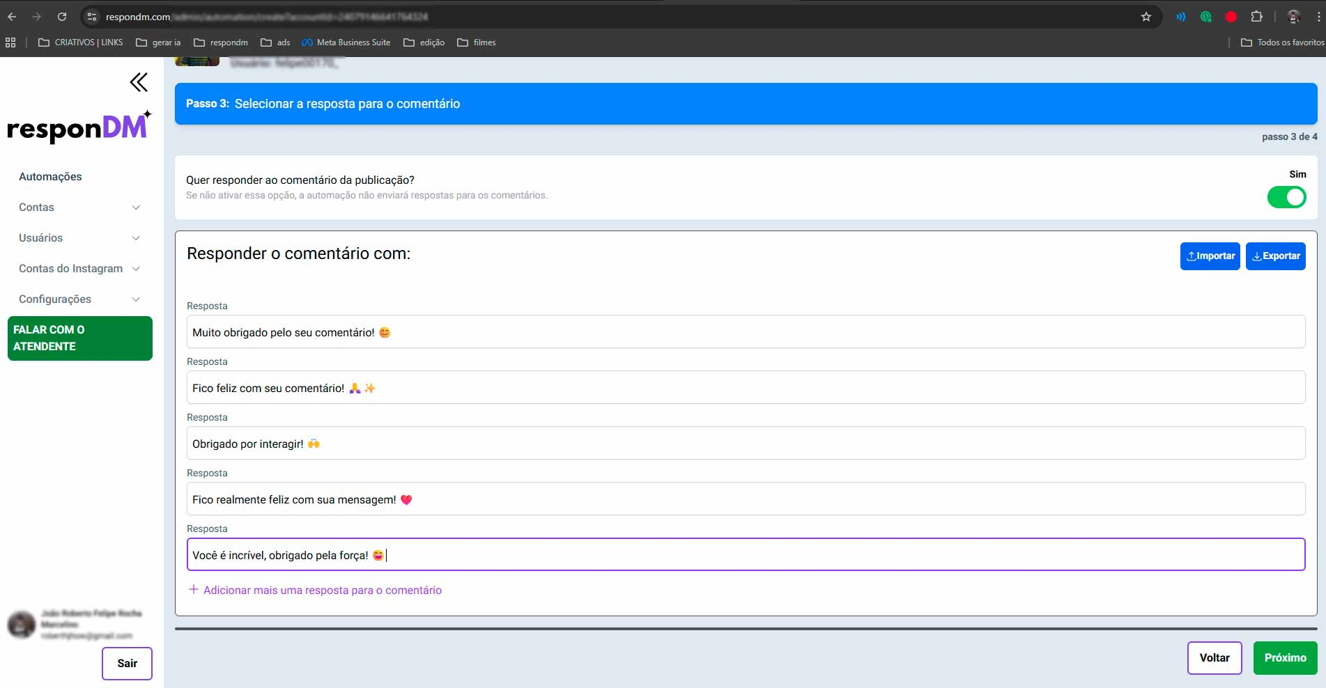 - Escolha uma automação simples para inaugurar (ex: responder a comentários).