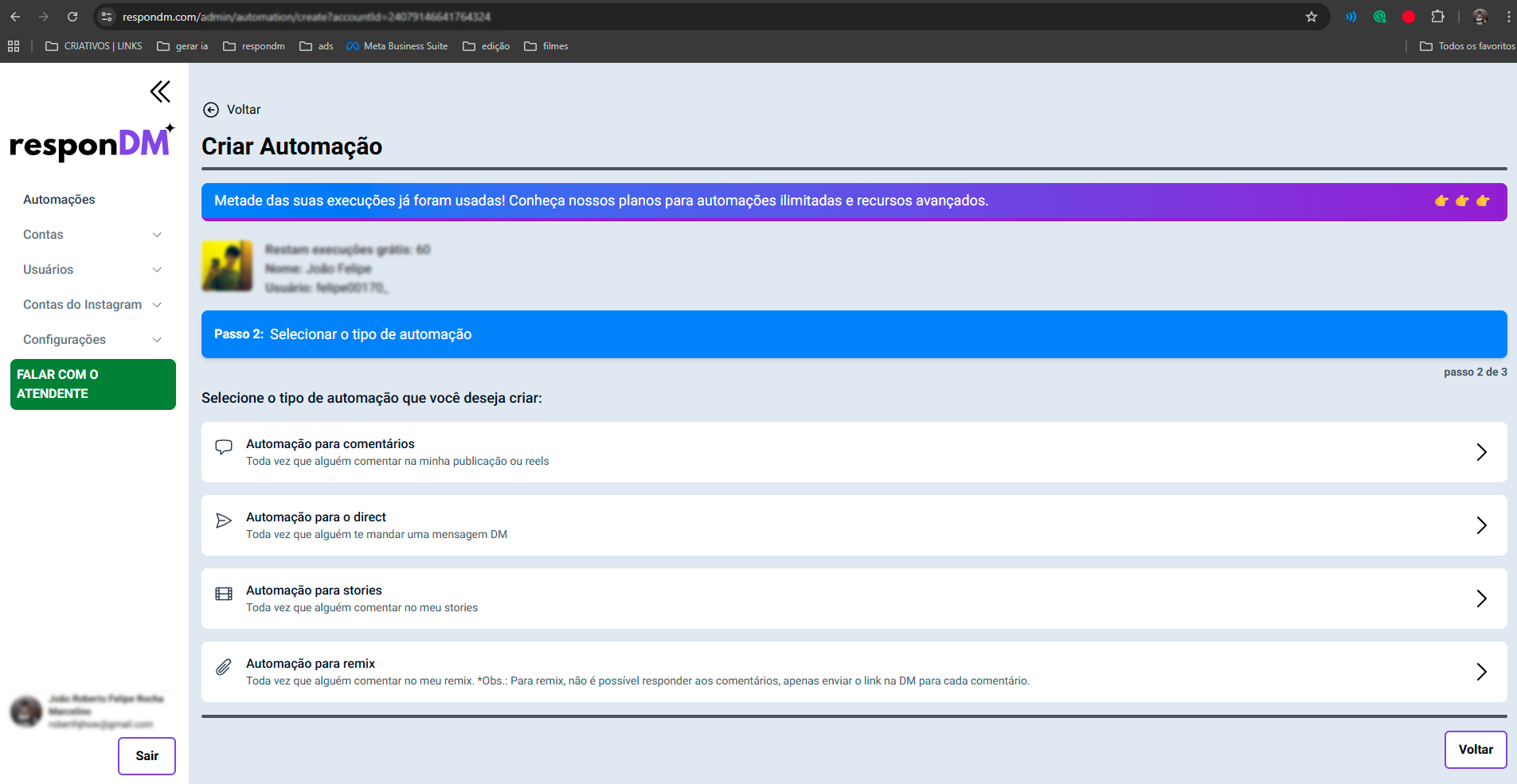 Agora selecione qual tipo de automação deseja ativar. A ResponDM oferece 5 opções, e você pode escolher a que melhor se encaixa no seu objetivo: