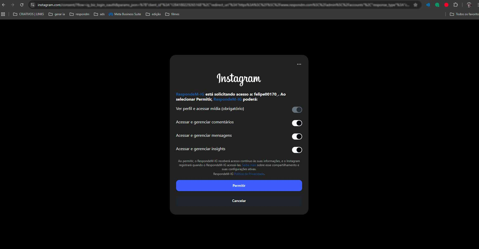 Mantenha todas as permissões acima marcadas para garantir que a ResponDM funcione perfeitamente na sua conta.