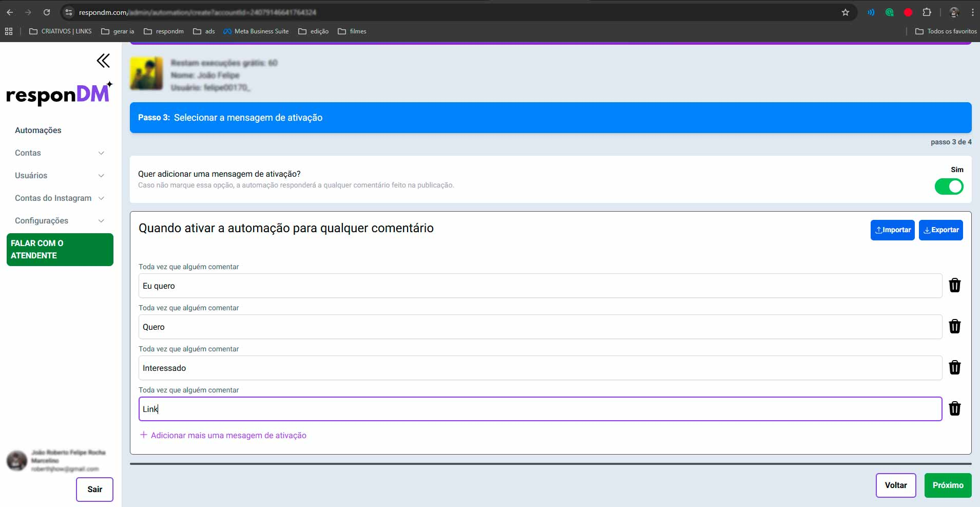 Na ResponDM, você pode definir quais palavras vão ativar a sua automação. É possível adicionar novas, excluir as que não fizerem sentido ou, se preferir, deixar a opção desativada para que qualquer comentário ative a automação automaticamente.