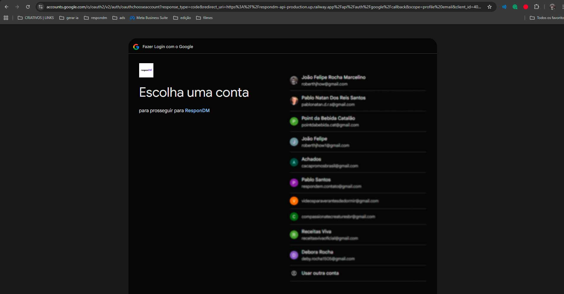 Após clicar no botão "entrar" na página inicial da ResponDM, você será redirecionado para realizar o login com a sua conta google, selecione o gmail que deseja usar e dê um clique.