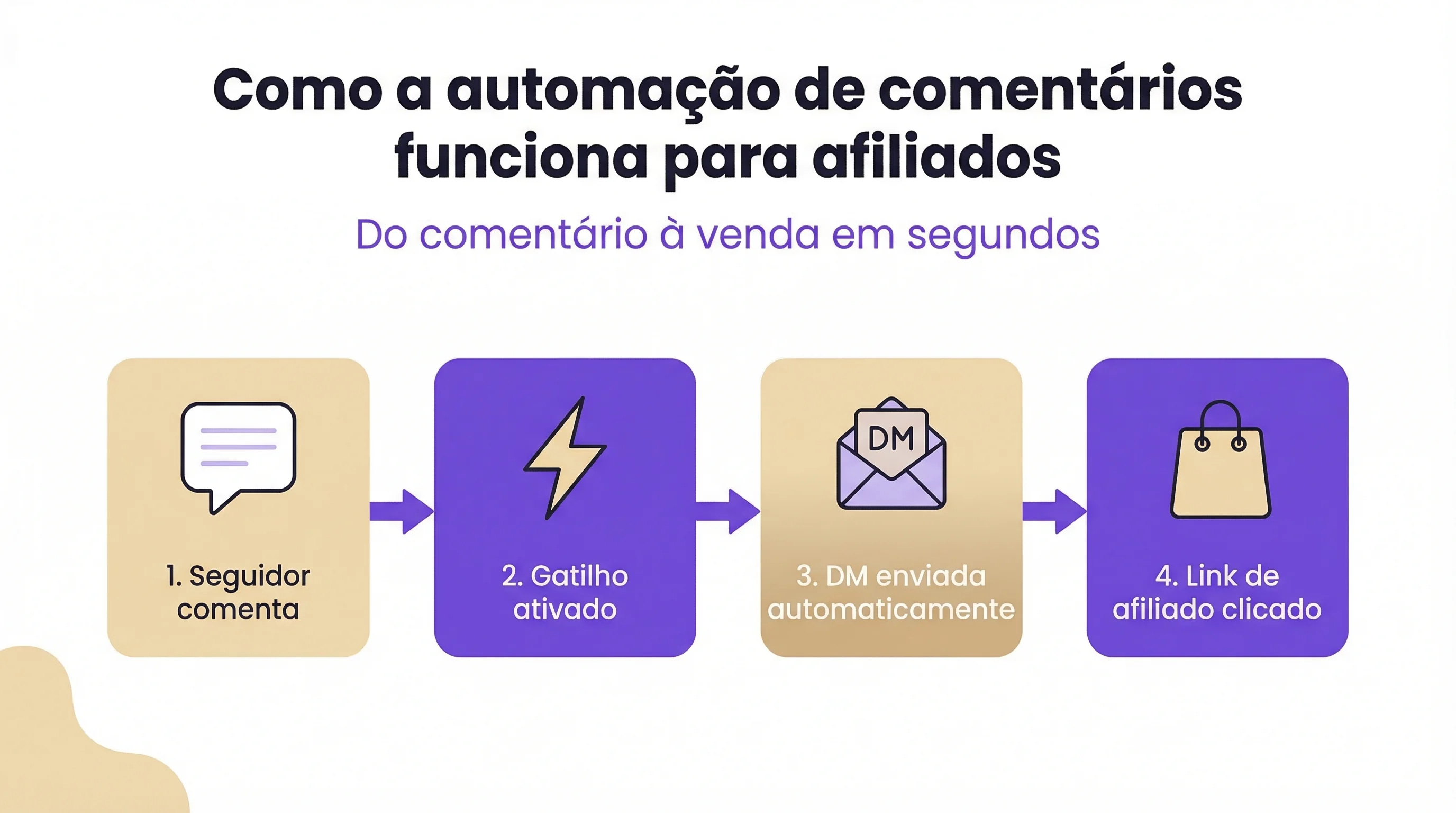 O mecanismo é simples. Você define uma palavra-chave como gatilho. Qualquer pessoa que comentar essa palavra no seu post recebe automaticamente uma mensagem na DM com o link de afiliado. Sem atraso, sem sua intervenção, sem limite de horário.