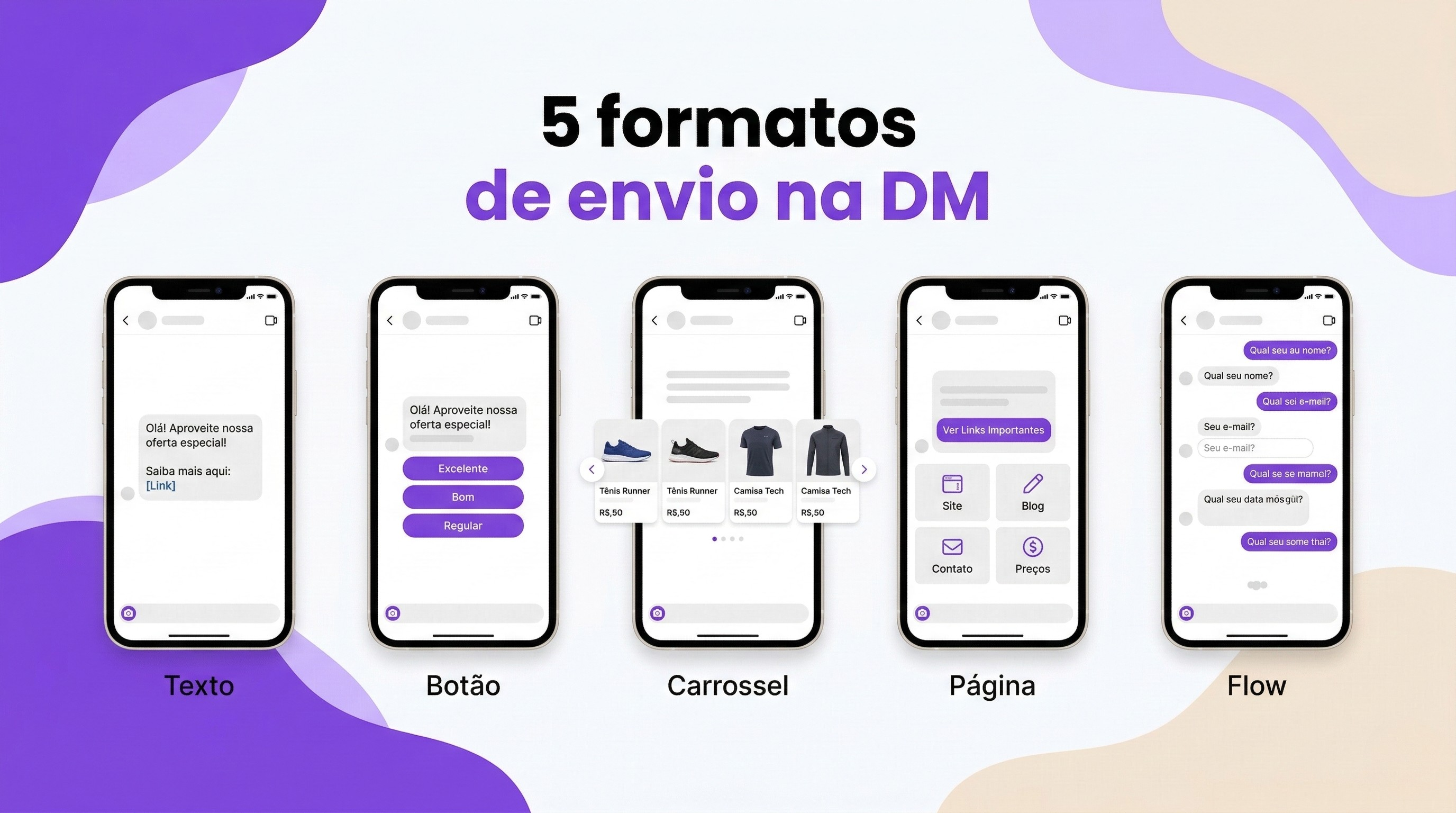- Escolher entre 5 formatos de envio na DM: Texto, Botão, Carrossel, Página e Flow