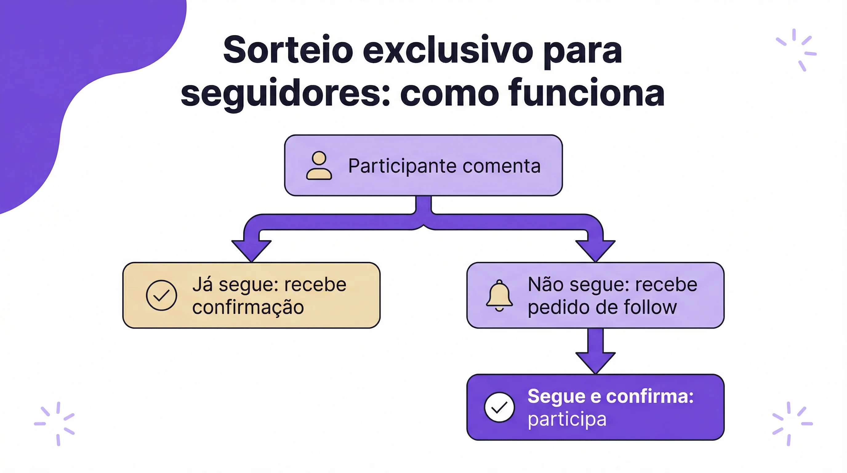 Essa é a estratégia ideal para quem quer usar o sorteio como alavanca de crescimento de perfil. A lógica é simples: quem comenta no post do sorteio só recebe a confirmação de participação via DM se já seguir o perfil. Quem ainda não segue recebe uma mensagem pedindo que siga antes de continuar.