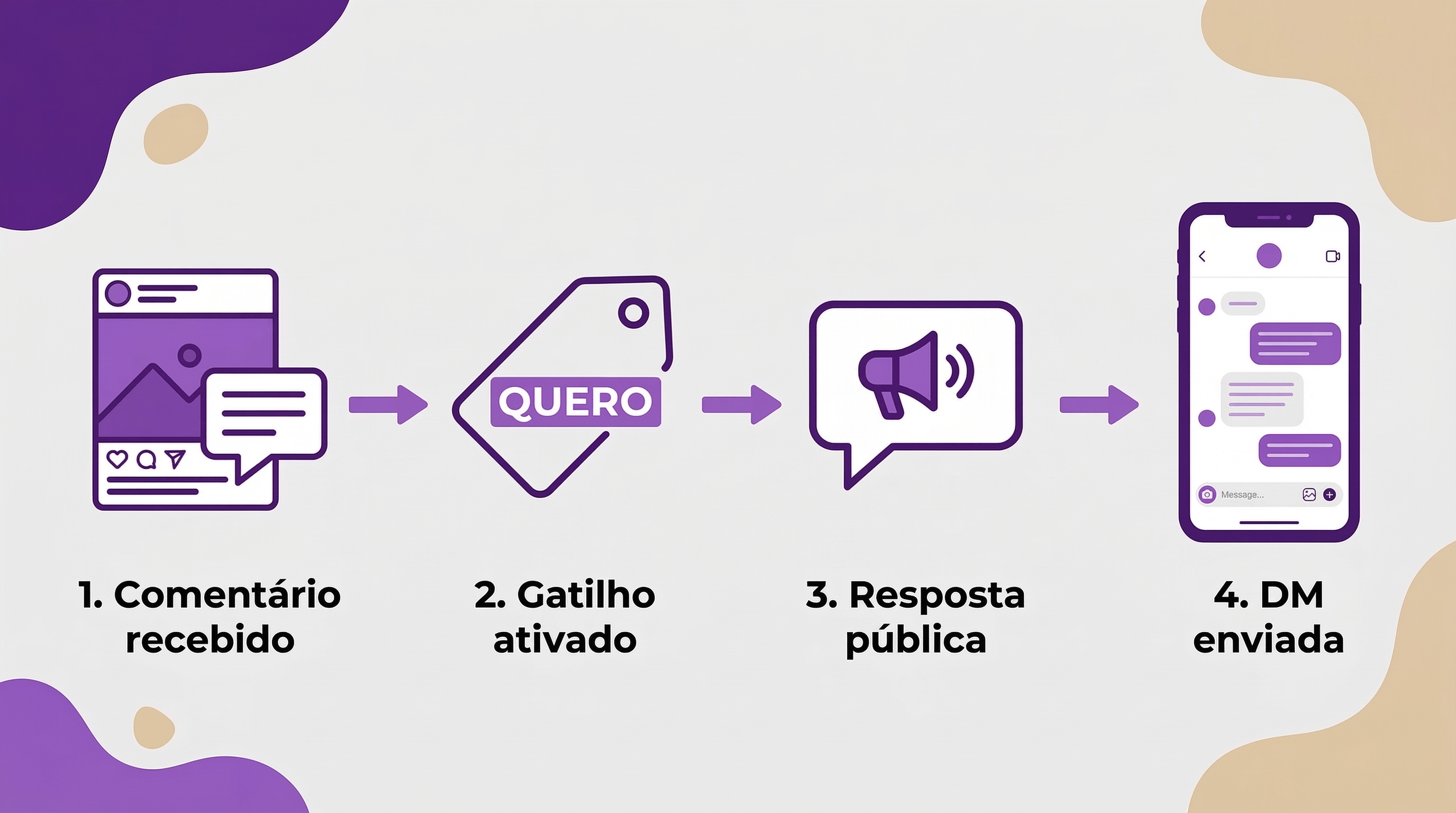 A automação de comentários funciona com uma lógica simples: quando alguém comenta uma palavra específica no seu post, o sistema entra em ação automaticamente, respondendo no comentário e enviando uma mensagem na DM.
