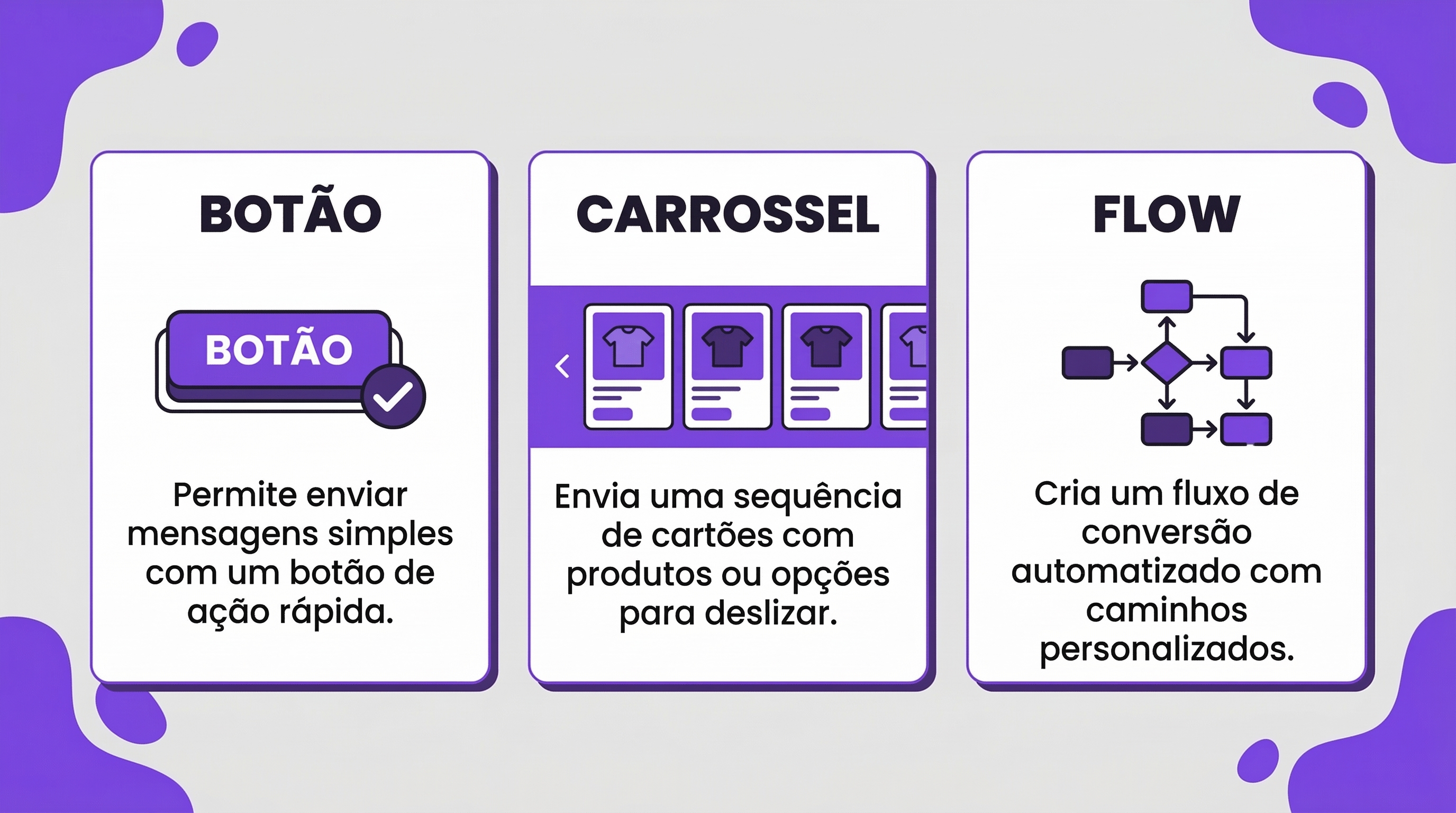 - Carrossel: até 10 cards com imagem, título e botões, ideal para quem vende produtos físicos.