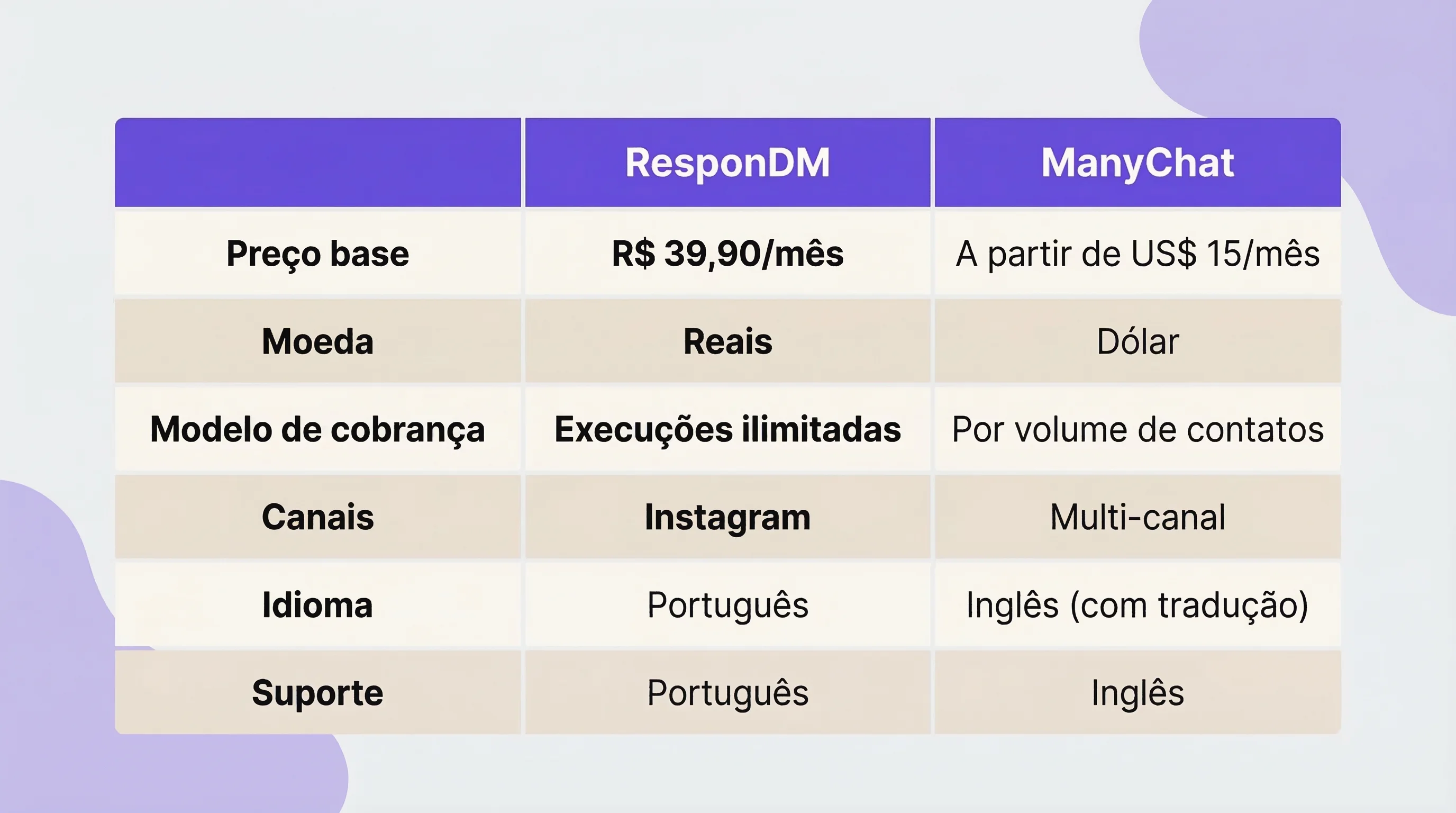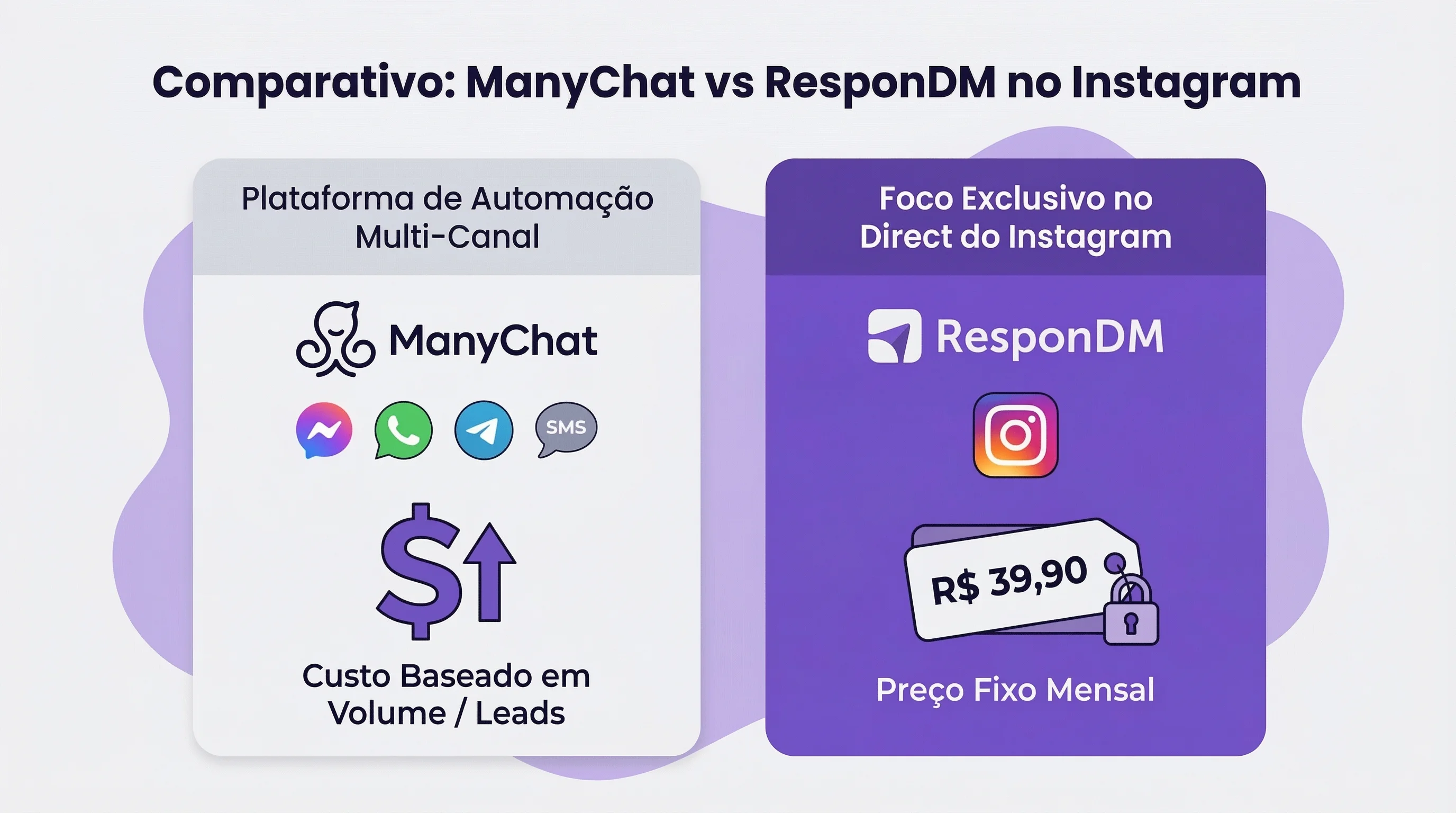 Qual é a principal diferença entre ResponDM e ManyChat? A principal diferença está no foco e no modelo de preço. O ManyChat é uma plataforma multicanal americana com precificação em dólar por volume de contatos. A ResponDM é uma ferramenta brasileira focada exclusivamente no Instagram, com plano único de R$ 39,90 por mês e execuções ilimitadas, sem variação por volume.
